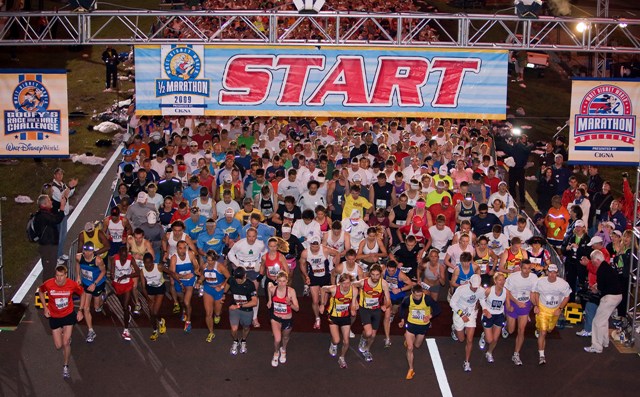 Runners begin their 13.1-mile trek during the Walt Disney World Half Marathon on Jan. 10, 2009. 17,000 athletes entered the annual race which took runners on a journey through Epcot and the Magic Kingdom theme parks. The 16th annual Walt Disney World Marathon takes place January 11th and over 22,000 athletes will run 26.2-miles through all four Walt Disney World theme parks. (Matt Stroshane, photographer)