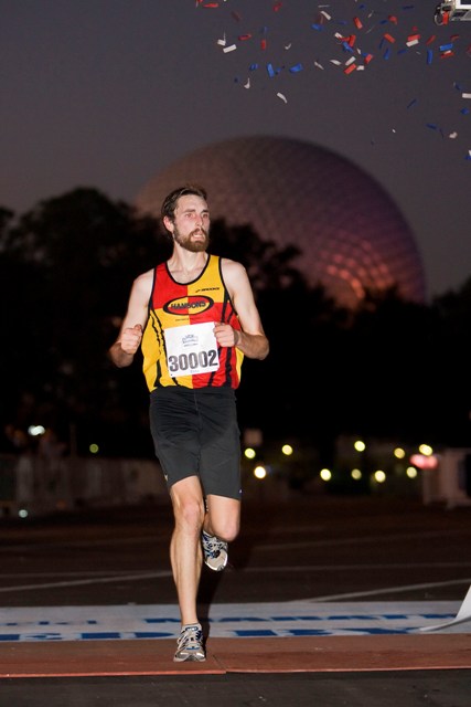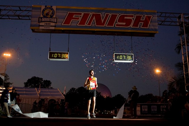 David Jankowski crosses the finish line to win the Walt Disney World Half Marathon which took place January 10, 2009. Jankowski, from Rochester Hills, Mich., broke the tape with a time of 1:07:36. The Walt Disney World Marathon will be held January 11th where athletes will run 26.2-miles through all four Walt Disney World theme parks. (Matt Stroshane, photographer)
