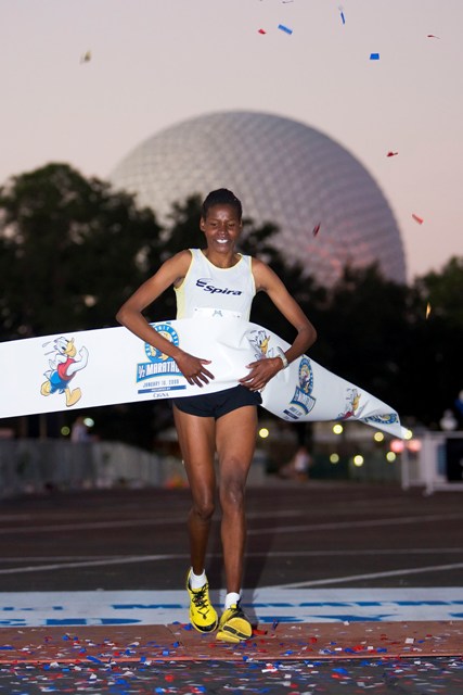 Elizabeth Chelagat, Las Cruces, N.M., finished first in the Walt Disney World Half Marathon which took place January 10, 2009. 17,000 athletes entered the annual race which took runners on a journey through Epcot and the Magic Kingdom theme parks. The 16th annual Walt Disney World Marathon takes place January 11th, where athletes will run 26.2-miles through all four Walt Disney World theme parks. (Matt Stroshane, photographer)