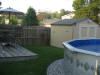 10x10 wood shed, 1 car garage, professional landscaped backyard with